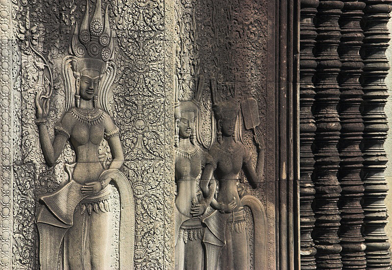 Two apsaras arm in arm in Angkor Wat.