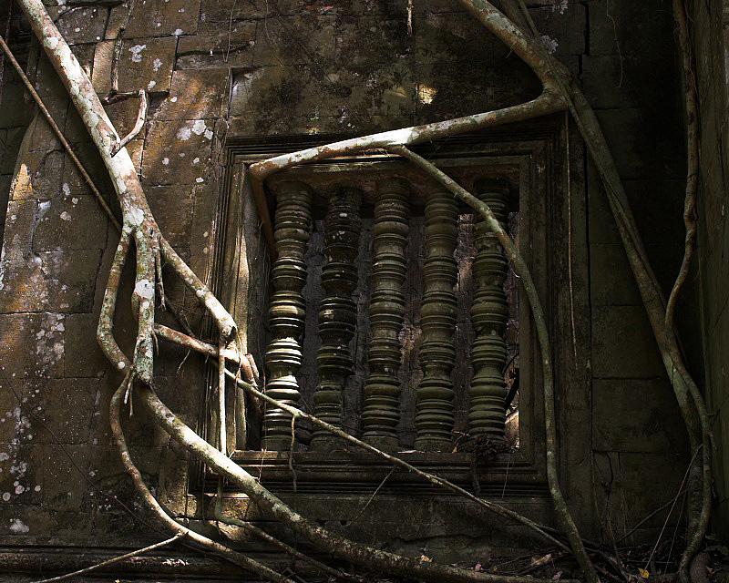 Stranger fig roots surrounding a window in Beng Melea.