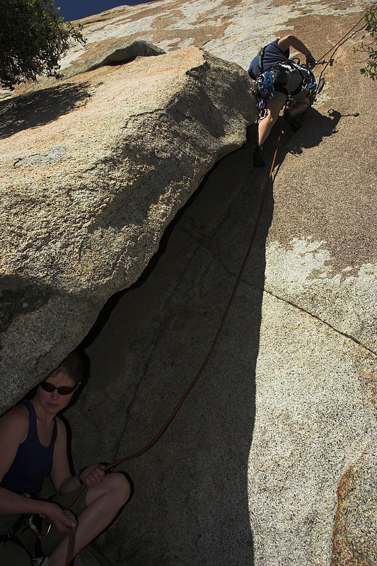 Caroline moving into the shady belay spot after Danielle clears the detached flake.