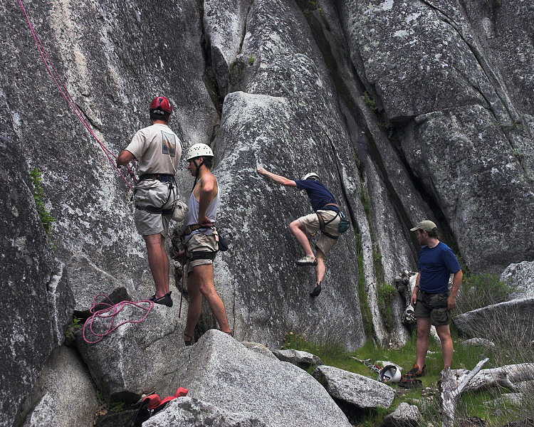 Jesse preparing to top rope a 5.10a slab, belayed by Martin. Adrian bouldering in the background with Ben observing.