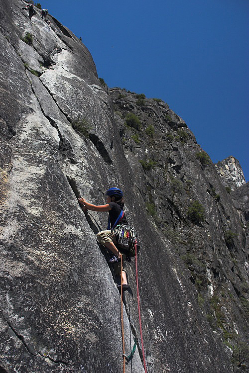 Chris hand jamming up the crack with perfect clear blue skies. In the background, Danielle and another party are at the end of the third pitch.