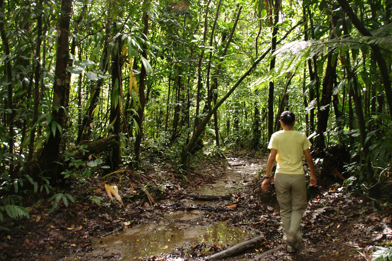 The trail is extremely muddy and winds through secondary rainforest.