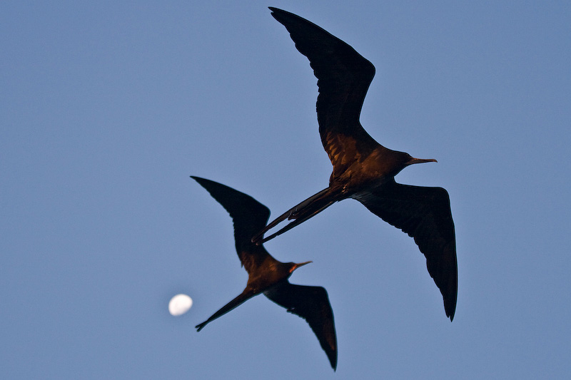 Frigatebirds flying over the Monserrat II at sunset