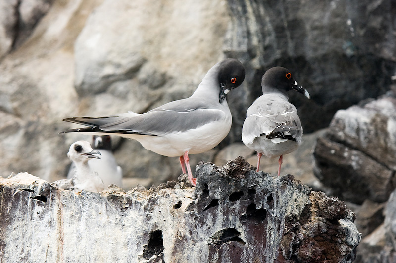 Two Swallow-tailed Gulls and their baby on Genovesa