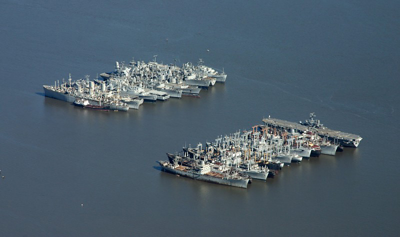 Decommissioned Navy ships berthed in the Sacramento River. There's a aircraft carrier at the end of the bottom row.