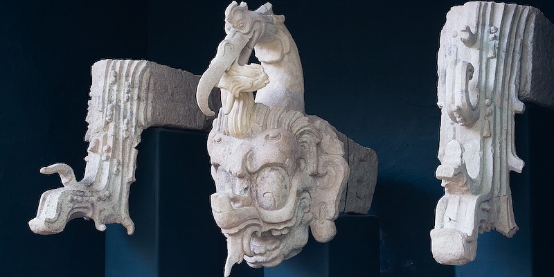 The most impressive sculpture in Copan. In the center is a depiction of a crane with a fish in its beak and a human head in its body. To the left and right are depictions of a waterfall.