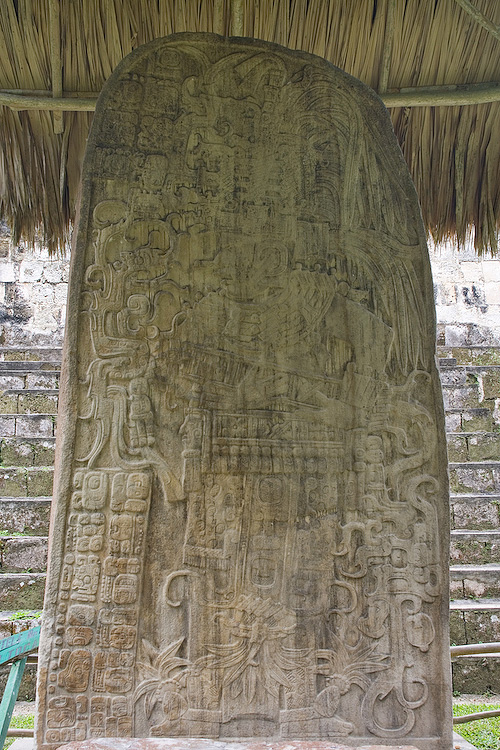 Stela at Ceibal protected against the elements by a thatch roof.
