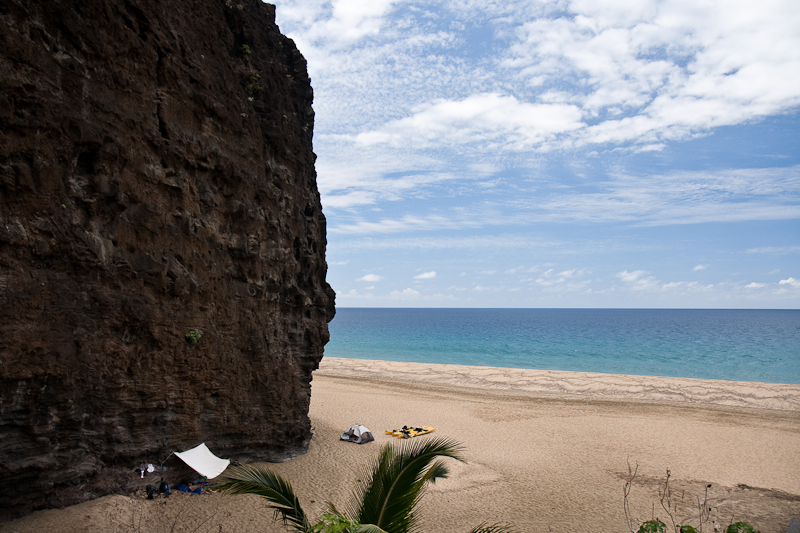 At one end of Kalalau beach, near the waterfall. We saw some people camping right under the chossy rock cliffs, which didn't seem like a great idea.
