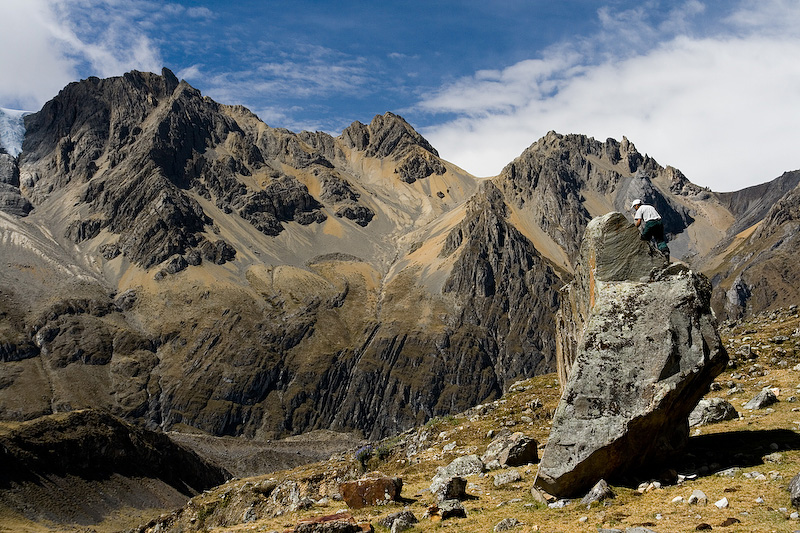 Zac bouldering near the Siula Grande base camp in Quebrada Sarapococha.