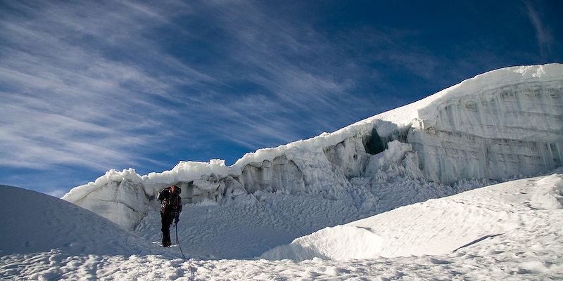 The short ice step (3 m) that leads onto the summit slopes on Ishinca.