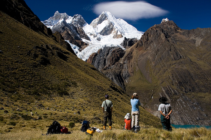 On the way up to Sambuya Punta (4750 m), Ray, Serene, Emily, and Zac checking out the odd lenticular like cloud over Yerupaja. In the bottom right is Laguna Solteracocha.