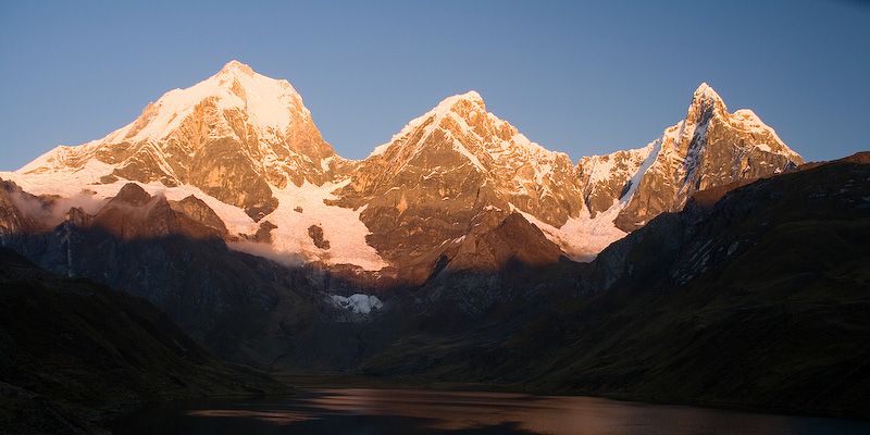 Sunrise on Yerupaja (6617 m), Yerupaja Chico (6089 m), and Jirishanca (6094 m) reflected in Laguna Carhuacocha (4138 m).