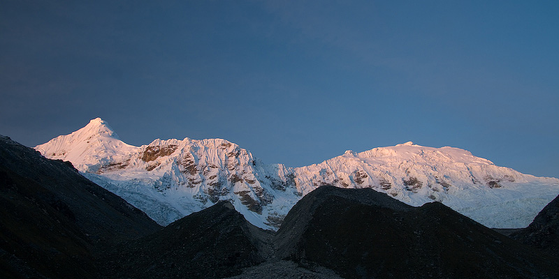Tocllaraju (6032 m) left and Palcaraju (6274 m) at sunset from Ishinca base camp.