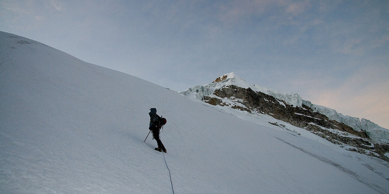 Jared further up the Ishinca glacier. The summit of Ishinca (5530 m) is on the right.