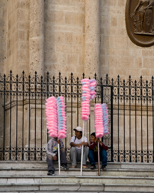 Candy floss vendors taking a break in the Arequipa Plaza de Armas.