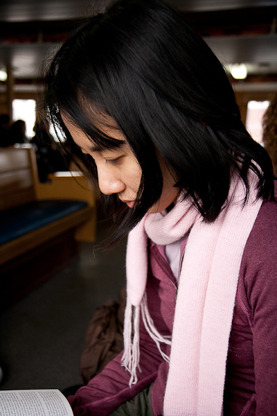 Serene reading the guidebook on the Bosphorus public ferry, Istanbul