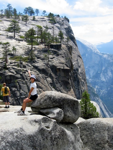 Serene pointing to Yosemite point.