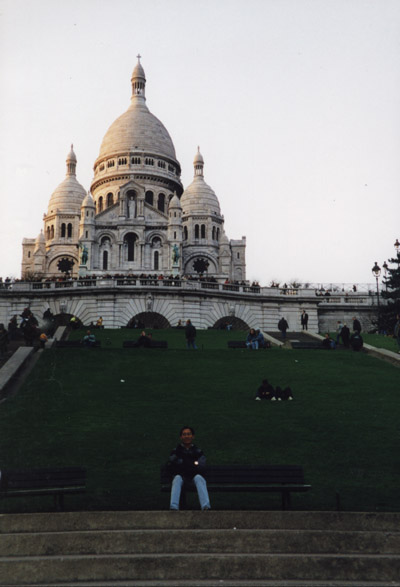 The basilica of the Sacred Heart on Montmartre. The basilica looks very pretty in the setting sun.